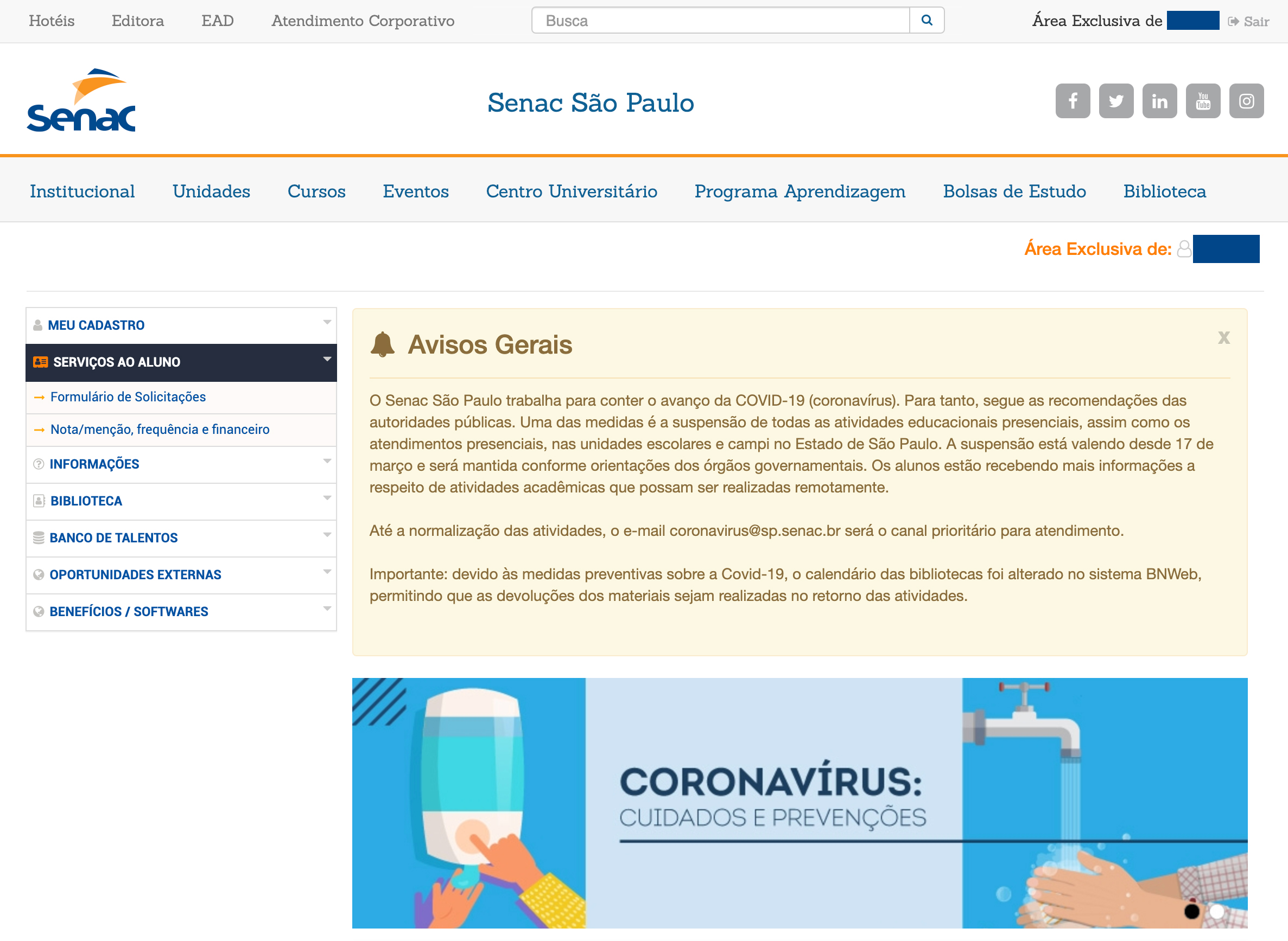 Alunos e público externo devem enviar dúvidas para coronavirus@sp.senac.br, e serão respondidas pela Central de Atendimento.
